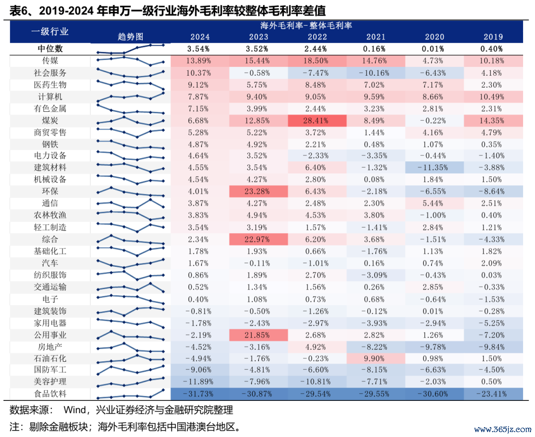 2024海外毛利率较整体毛利率占优较为显著的行业主要包括传媒(13.89pct)、社会服务(10.37pct)、医药生物(9.12pct)等,而食品饮料、美容护理、国防军工等行业的海外毛利率则明显不占优。动态来看,自2022年以来社服、电新、有色等行业的海外毛利率优势持续扩大。