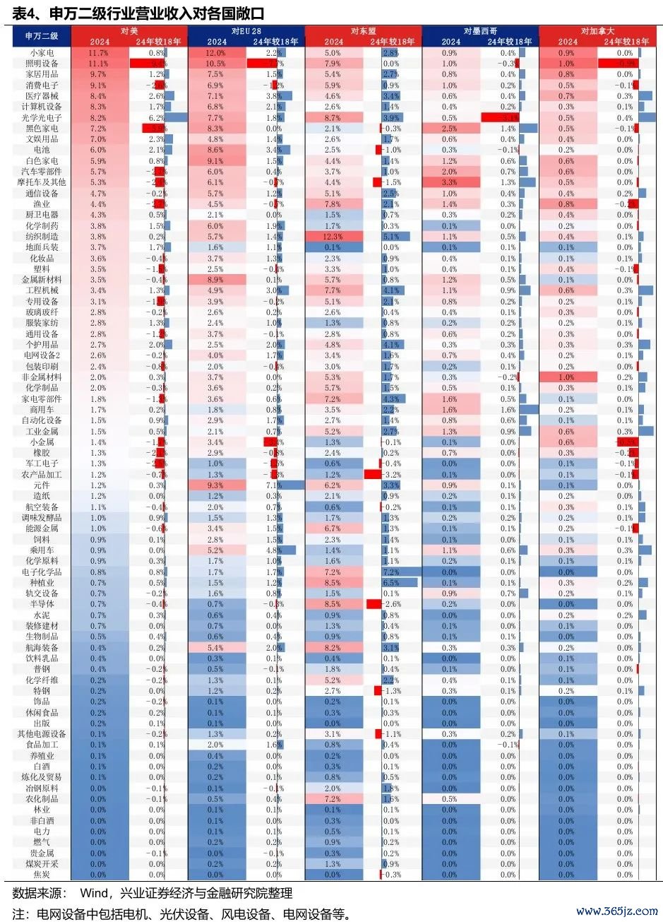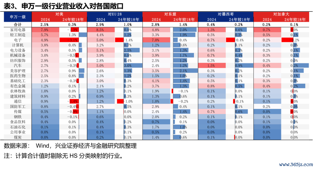 上市公司财报中所披露海外营收的局限在于无法拆分到面向各个国家和地区的具体情况,因此该行引入海关口径的数据来估算各行业的各国敞口。具体而言,该行将HS04海关分类一一对应至申万一级行业和二级行业,并用【行业内上市公司海外营收占比X行业对各国出口敞口】测算上市公司业务对各国出口敞口。其中: