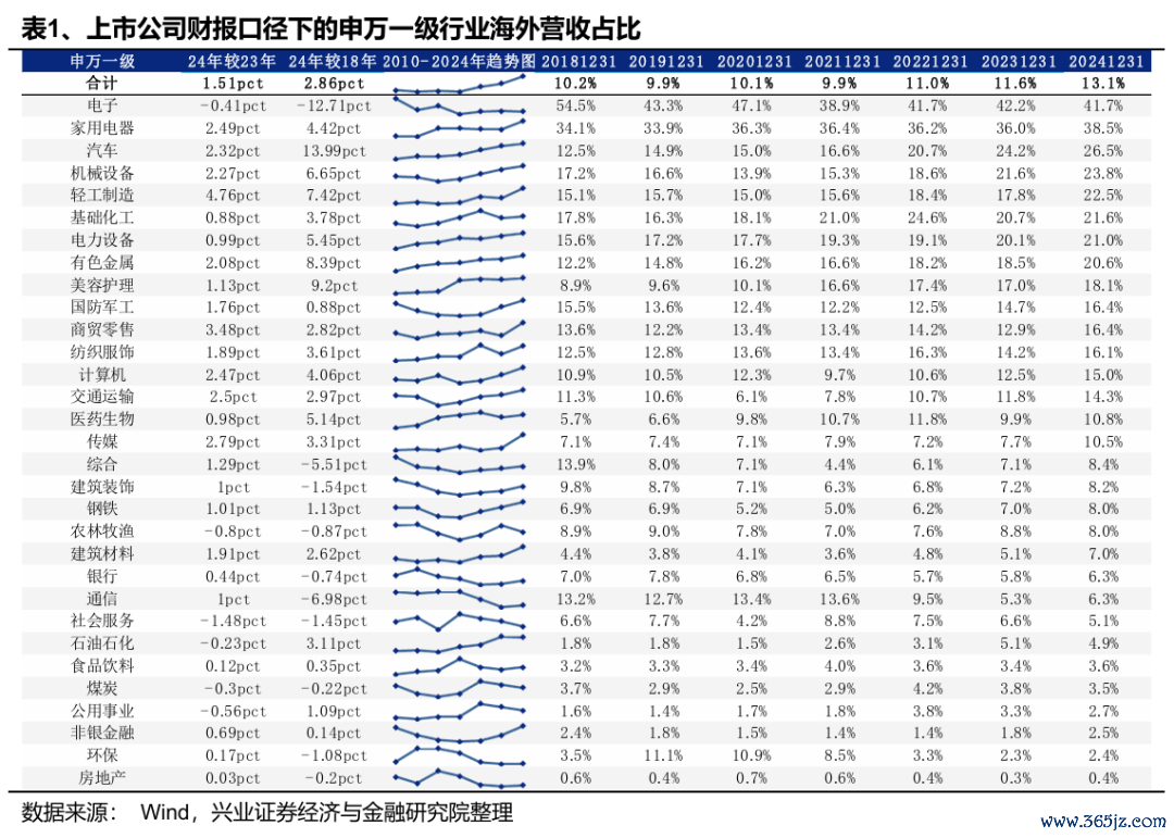 从一级行业来看,截至2024年底,海外营收占比最高的行业为电子(41.7%),家用电器(38.5%)次之,表明这两个行业对外需敏感度最高。海外营收占比在20%以上的行业还包括汽车(26.5%)、机械制造(23.8%)、轻工制造(22.5%)、基础化工(21.6%)、电力设备(21.0%)、有色金属(20.6%)等。