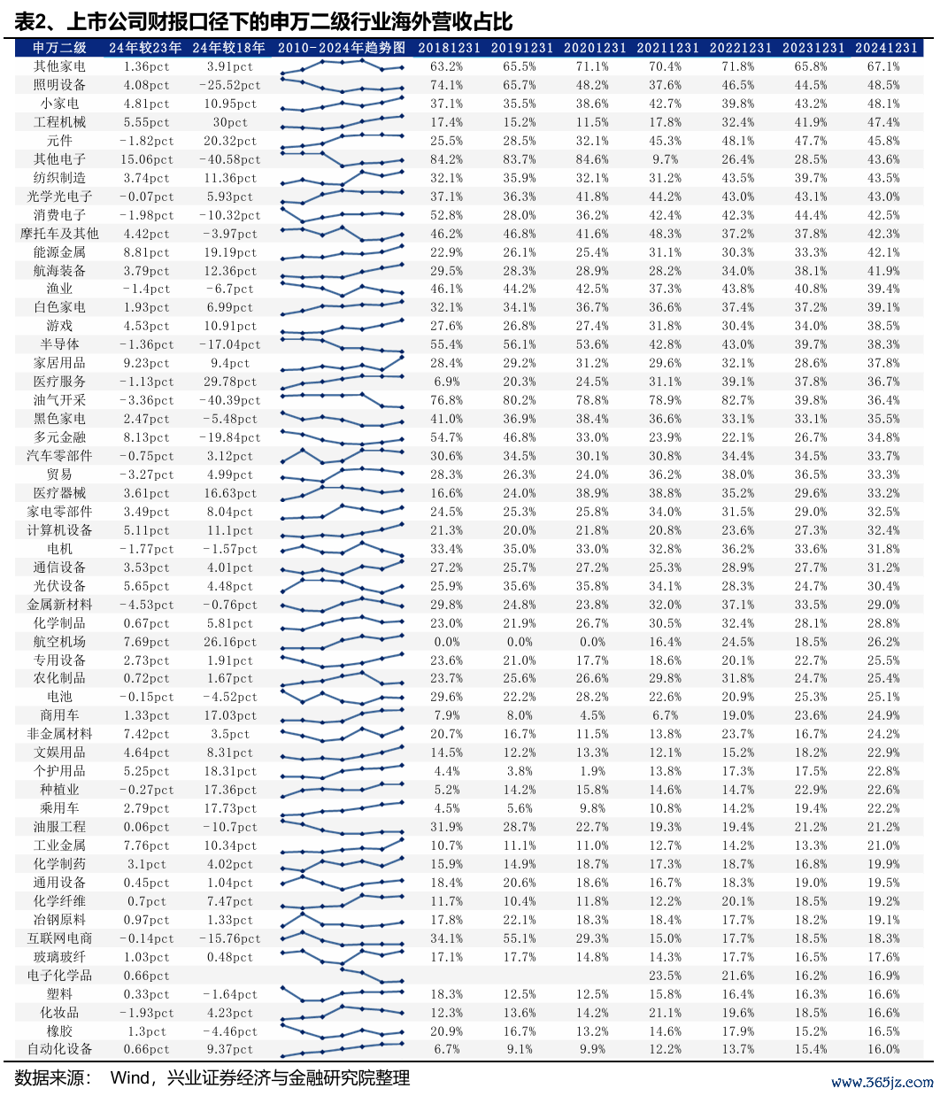 从二级行业来看,截至2024年底,高海外营收占比的行业以消费和电子板块居多。具体而言,2024年海外营收占比前十的申万二级行业包括:其他家电(67%)、照明设备(49%)、小家电(48%)、工程机械(47%)、元件(46%)、其他电子(44%)、纺织制造(43%)、光学光电子(43%)、消费电子(42%)和摩托车及其他(42%)。